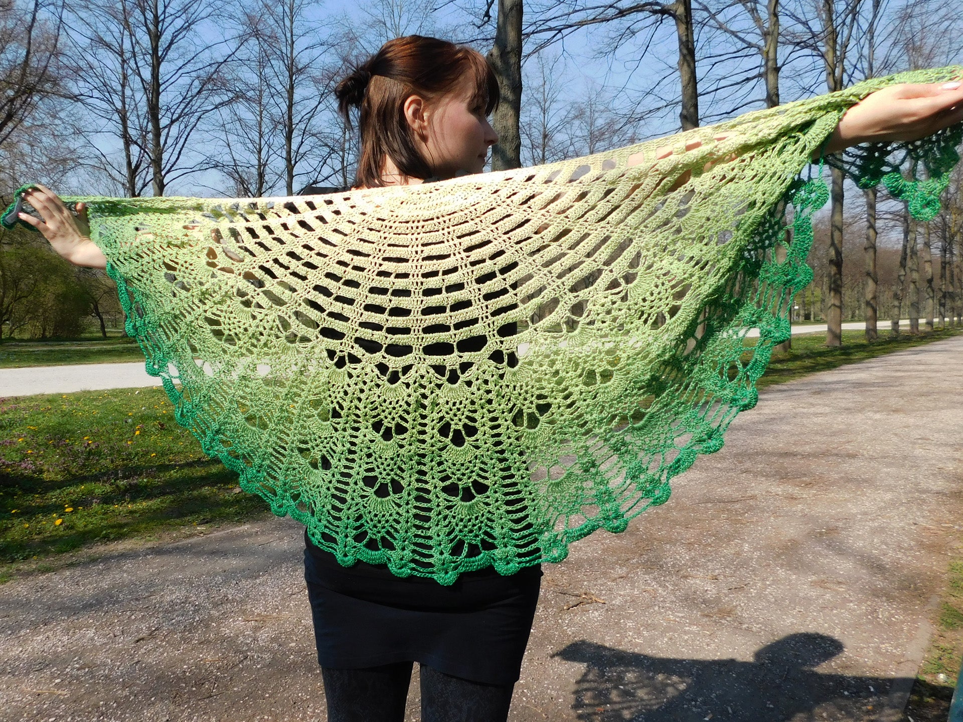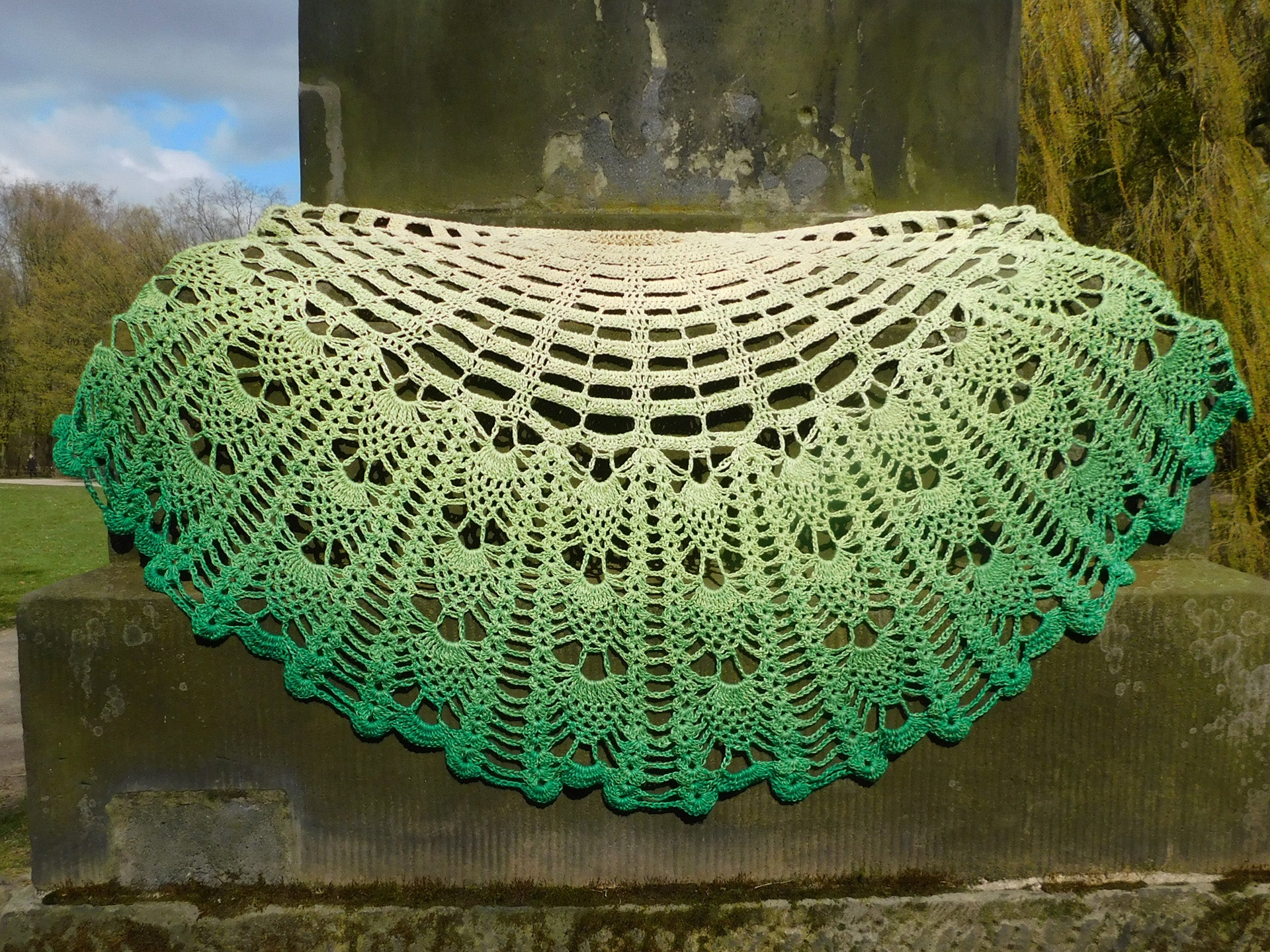 Das Tuch "Jallo" ist halbrung und hat zwei immer wiederkehrende Musterfolgen.